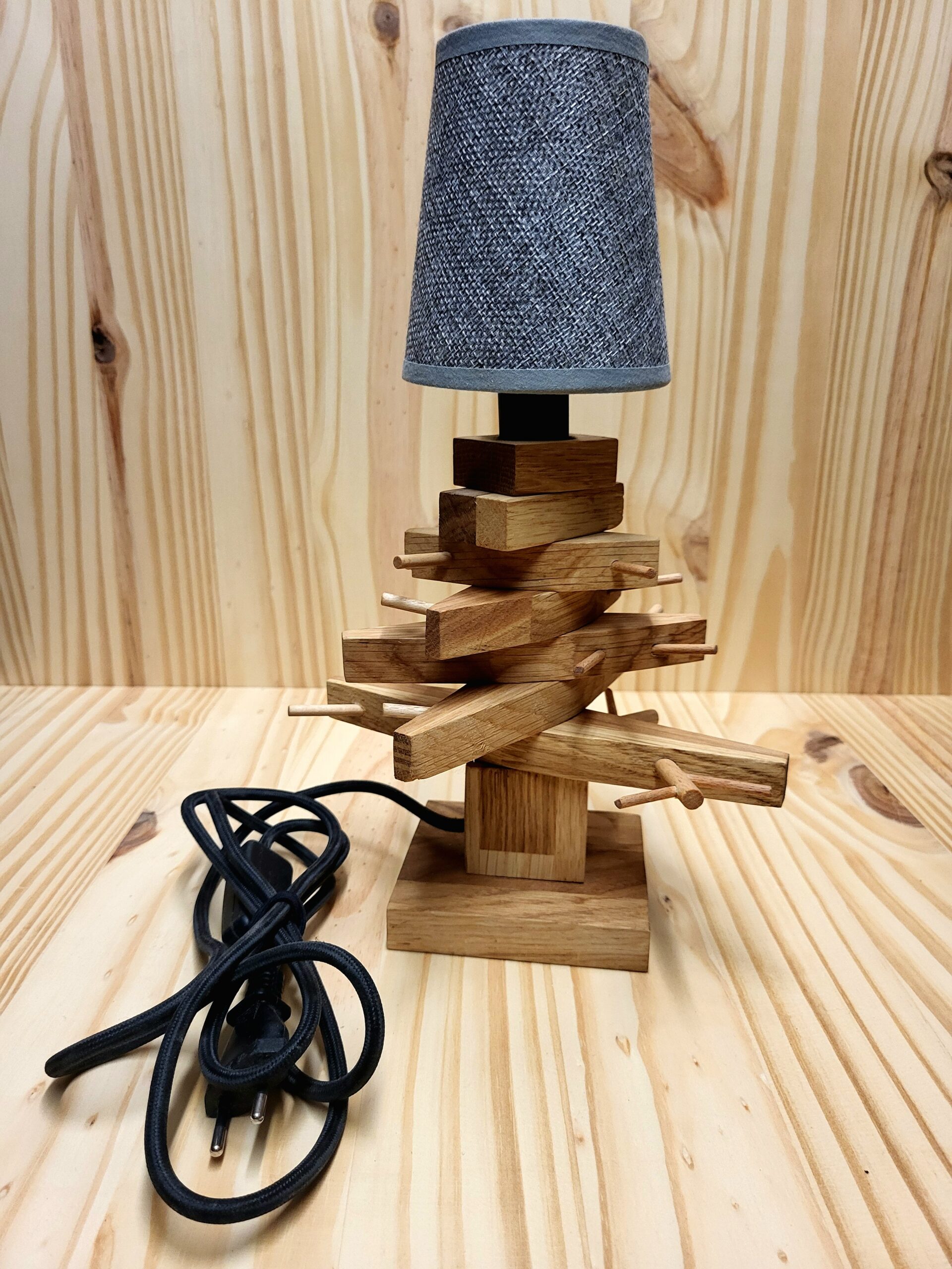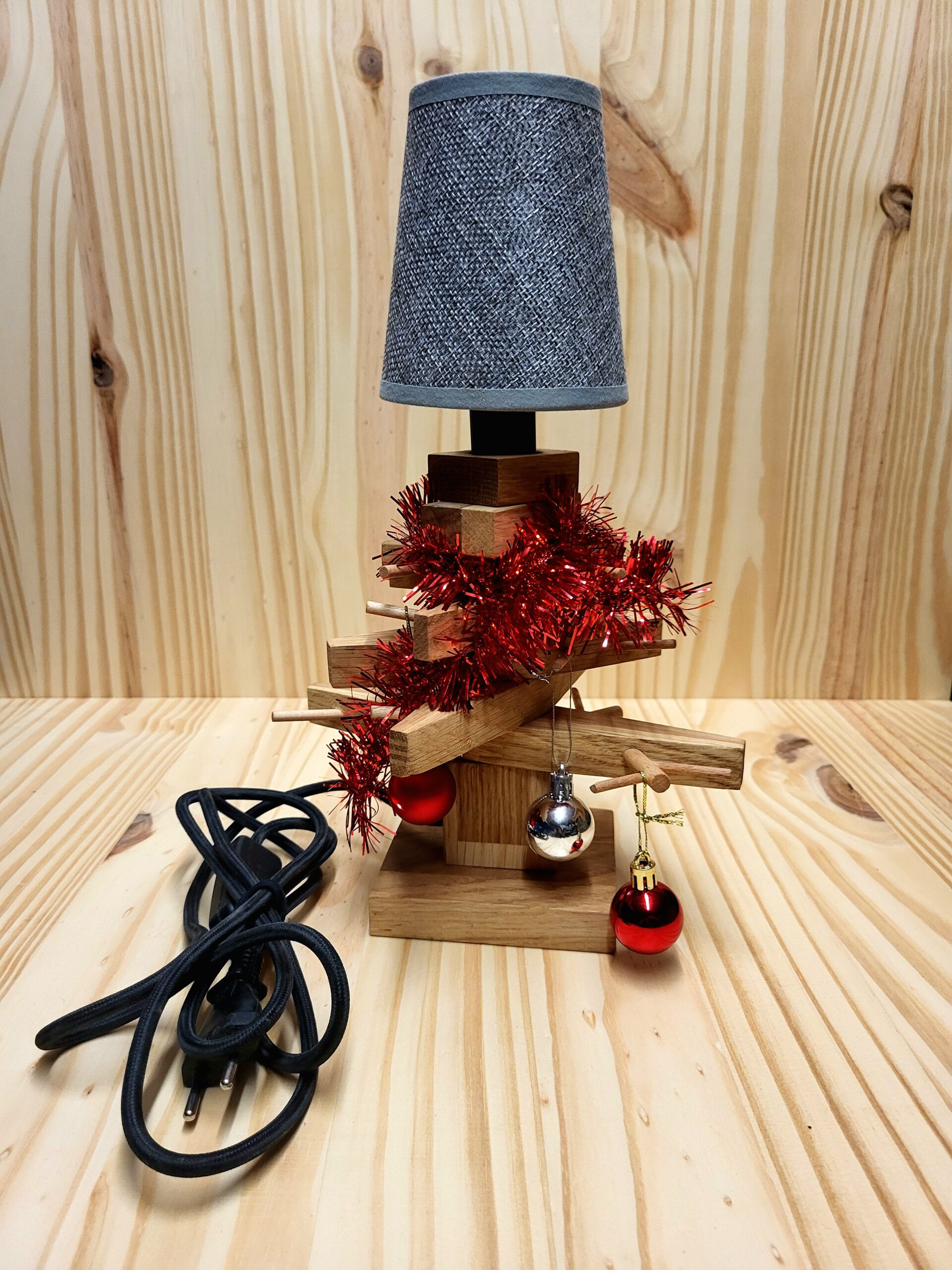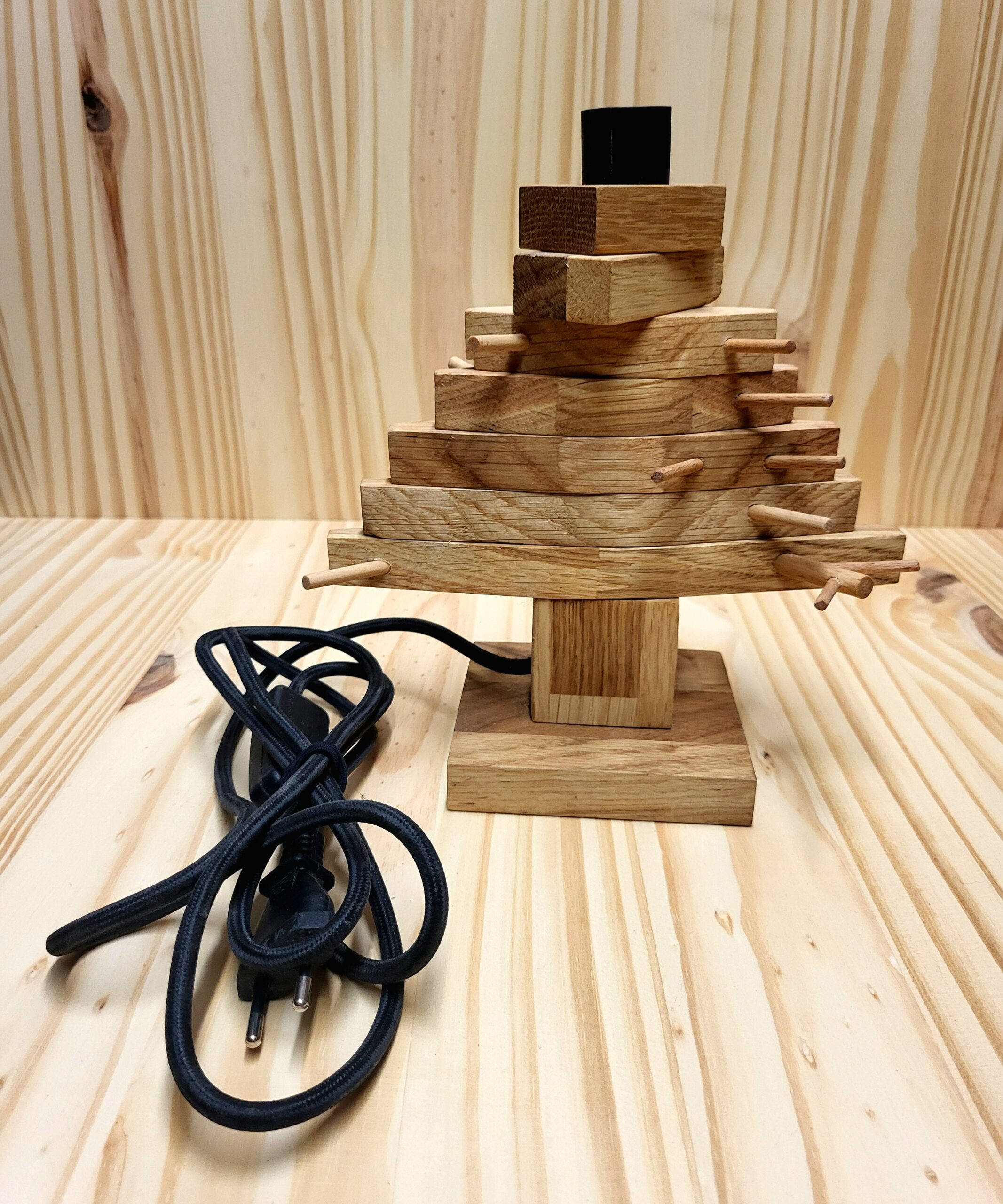 Jolie lampe de chevet en forme de sapin, entièrement en chêne. Branches en hêtre.