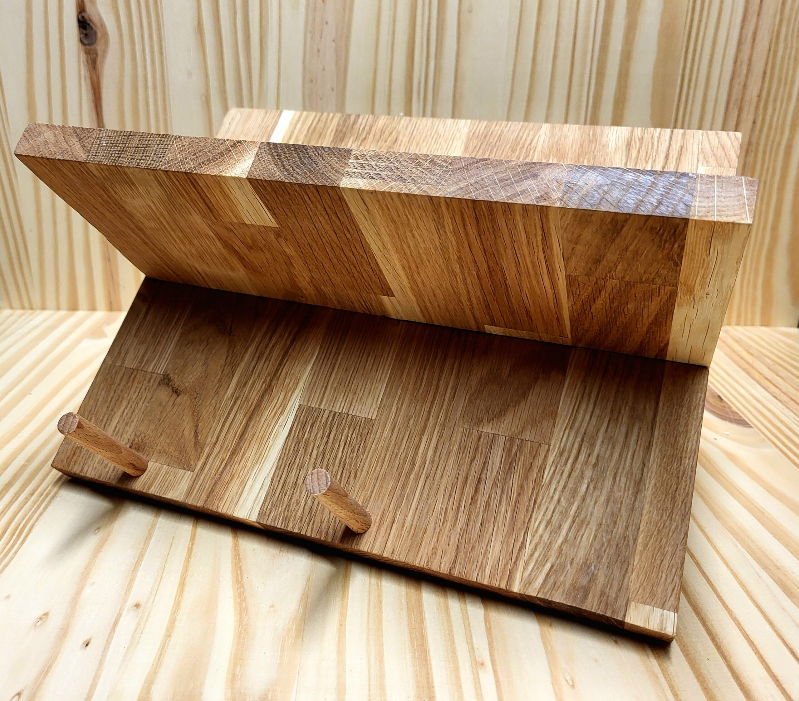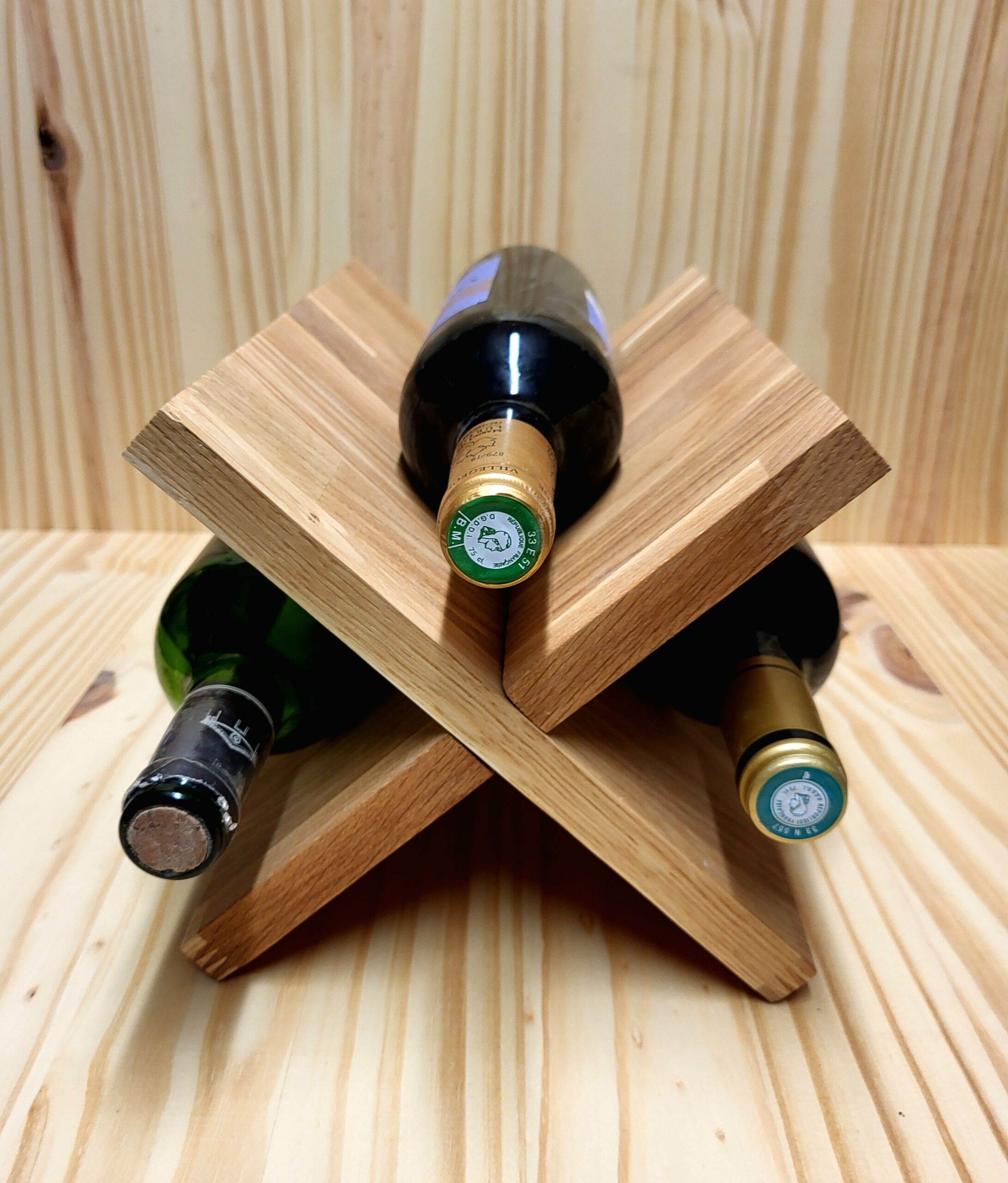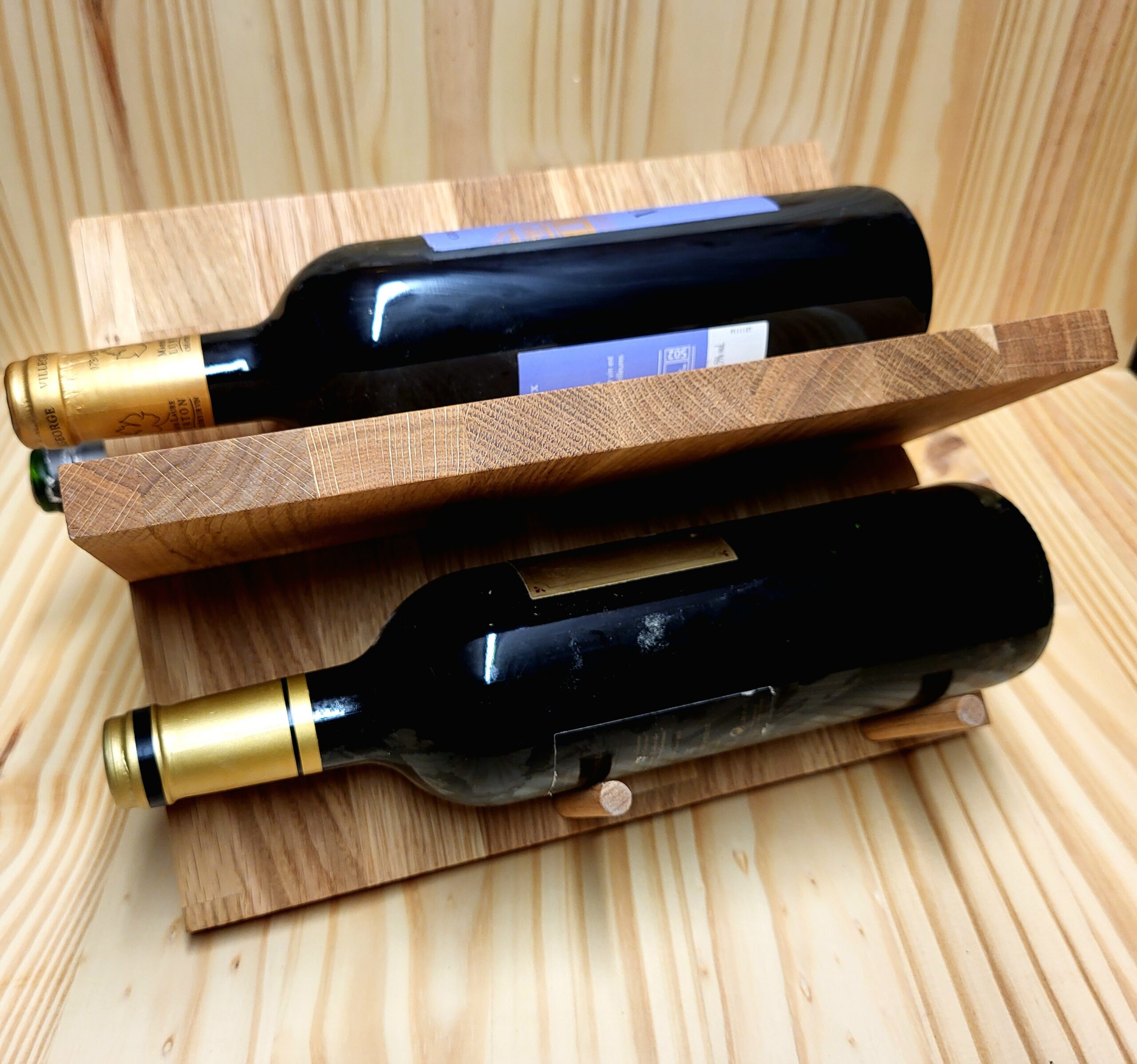 Porte-bouteilles, entièrement en chêne, pouvant accueillir 3 bouteilles (et une petite en bas). Les cales sont en hêtre.